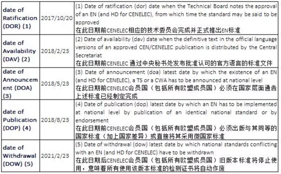 CENELEC中央秘书已于2018-02-23发布了EN 60598-1:2015/A1:2018的标准;该更新标准正式发布执行日期为2018-08-23,全面取代执行日期为2021-02-23,这就意味着从2021-02-23所有使用该版本标准的检测证书将自动作废,具体情况如下图所示: